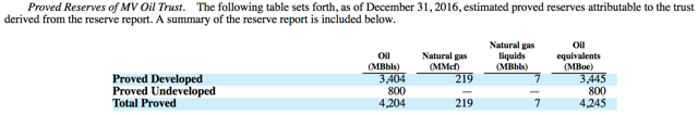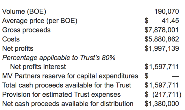 That means that the trust was entitled to the proceeds of 4.1M additional BOE as of 12/31/16. The trailing BOE production volume was 767K, which meant that MVO got paid on ~614K BOE.