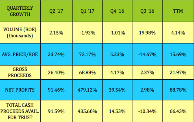 Q2 and Q1 ’17 had substantial improvements in gross proceeds, net profits, and total cash available for the Trust, thanks to big jumps in oil prices – average BOE prices jumped 72% in Q1 and 24% in Q2, continuing to improve after oil bottomed out in February 2016: