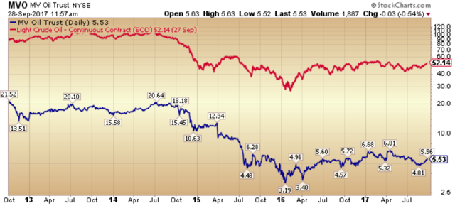 This five-year chart details how closely MVO’s price/unit is tied to the price of oil. When oil was up around $ 100 in 2013, MVO was $ 21.52. As oil bottomed out in early 2016, MVO went as low as $ 3.19, and has since recovered to ~$ 5.50, as oil is at $ 52.14.